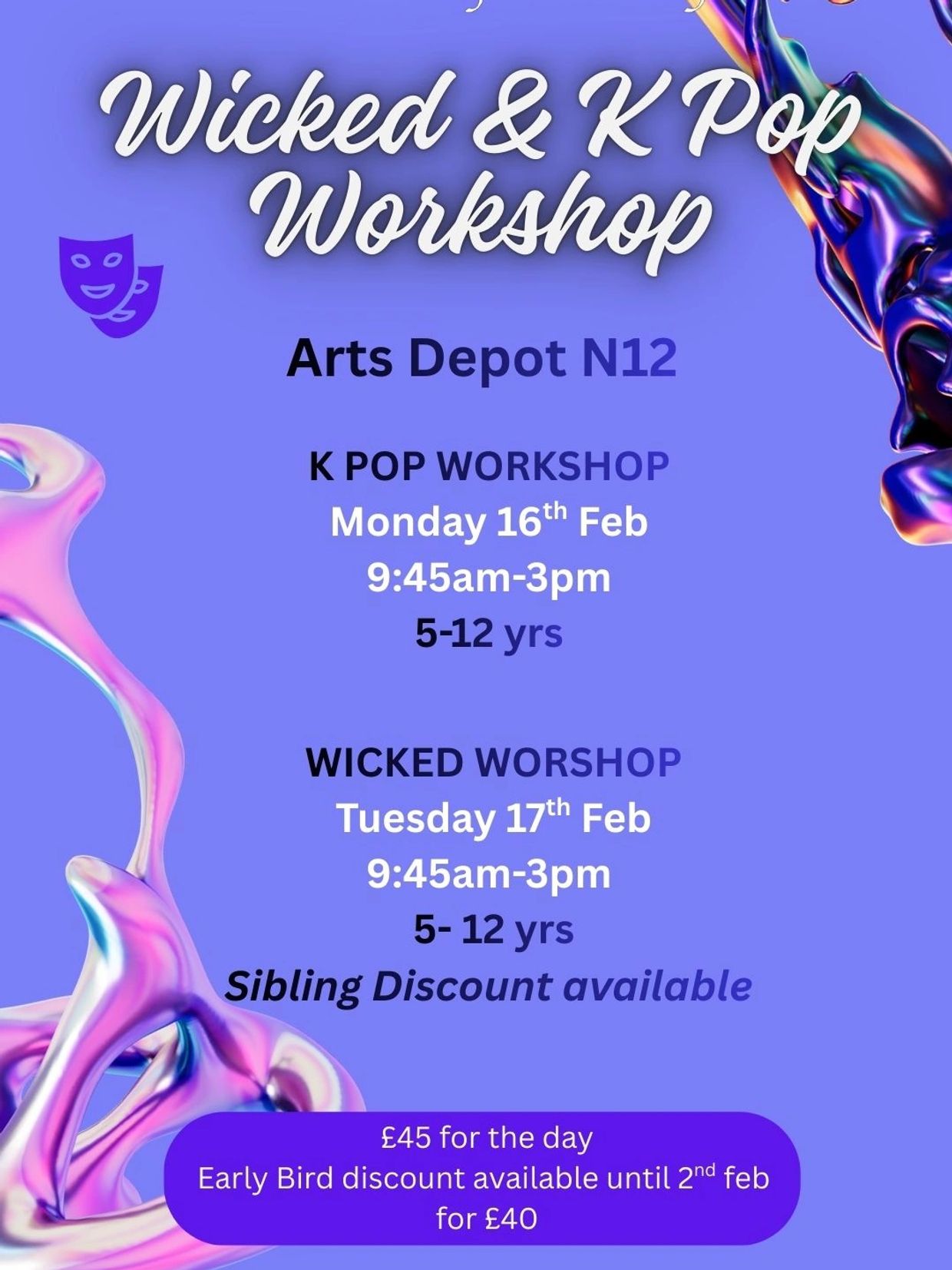 Join us this February half term for two exciting, high-energy workshops inspired by Wicked and K-Pop Demon Hunters! Designed for children aged 5–12, these sessions are perfect for young performers who love to dance, act, and express themselves.